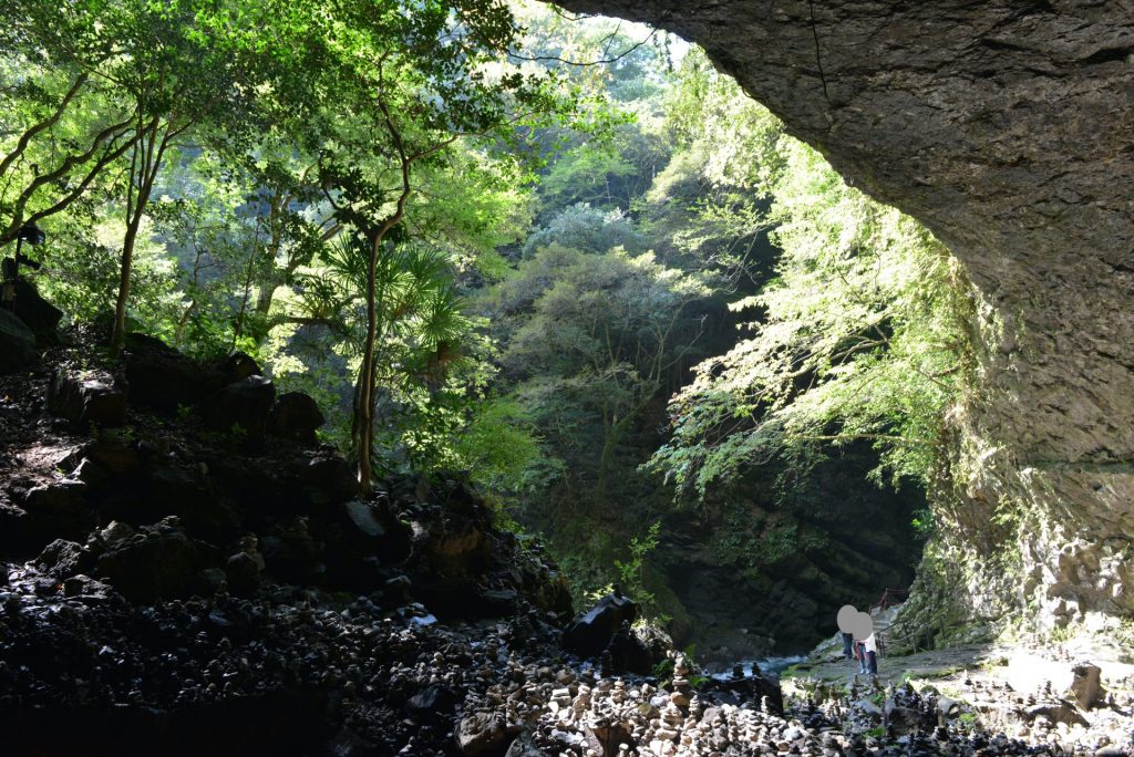遊歩道から天安河原宮の洞窟が見える場所まで来ると、幅も高さも予想していたのとは比較にならないほどの大きさに驚かされます。参道を進むと鳥居があり、その両側には隙間もないほどに積まれた小石が奥まで続いています。一番奥にある天安河原宮でお参り。八百万神が集まって、天岩戸に籠もった天照皇大神に外に出てもらう方法を相談したのがこの場所だそうです。