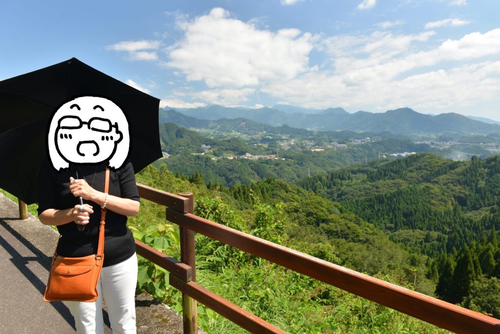 最後に向かったのが、国見ヶ丘展望台。天岩戸神社からは12kmほど、高千穂峡からは5kmほどのところにあります。緩やかな上りの先に駐車場がありました。ここから展望台はすぐ先です。高千穂の地域を一望することができます。高千穂観光の締めくくりとしました。
