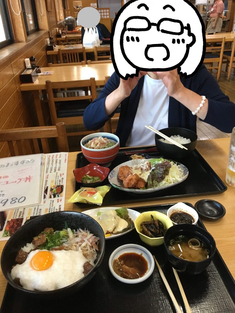 それでも、あとは、夕飯を食べて寝るだけです。大型車からはガラガラとエンジン音が聞こえてきます。できるだけ離れた場所に車を停めてご飯に行きました。レストランでは、わりと手の込んだメニューがあったので選び甲斐がありました。山かけのセットメニューを注文して美味しくいただきました。