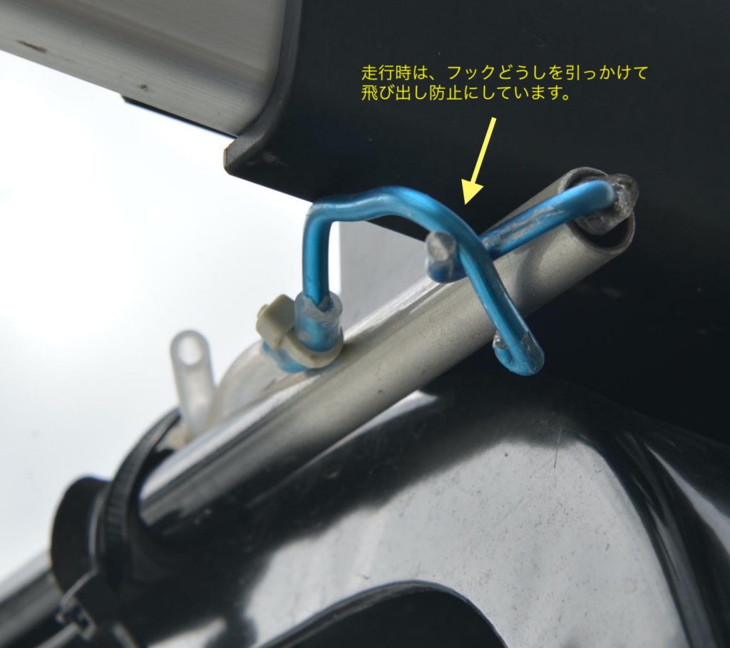 走行時には、釣り竿が飛び出さないように、別のフックで止めておくようにしました。