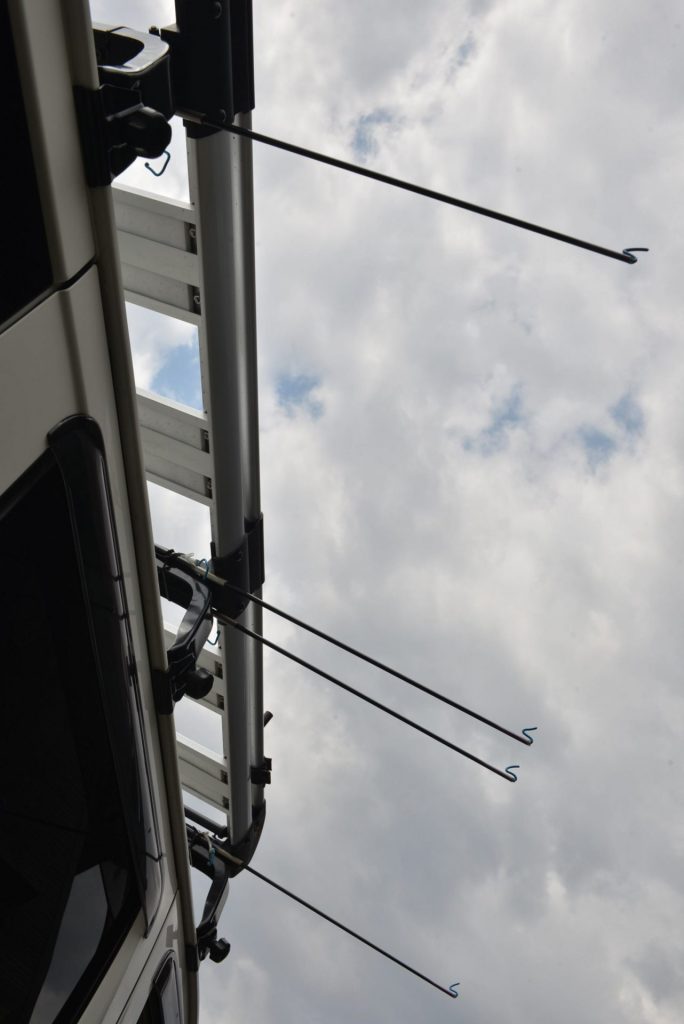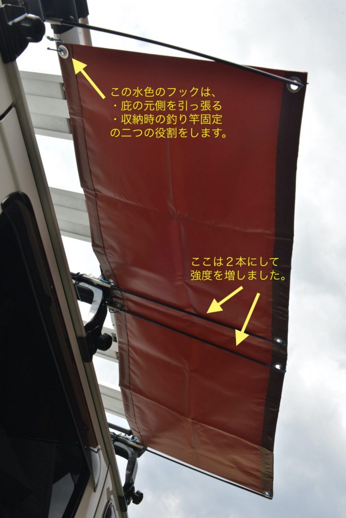 この釣り竿をキャリアに固定して、これに庇を付けようというのです。ネットで一番安く売っていたのを8本注文しました。左右に4本ずつです。今回も、ある程度の強度がほしいので、3、4番目だけを使いました。サイドのスライドドアをいっぱいに開いた時の幅に合わせて、キャリアに結束バンドで固定しました。結束バンドも「耐候性」のものがいいようです。