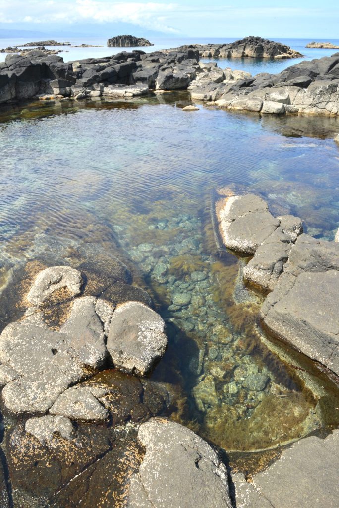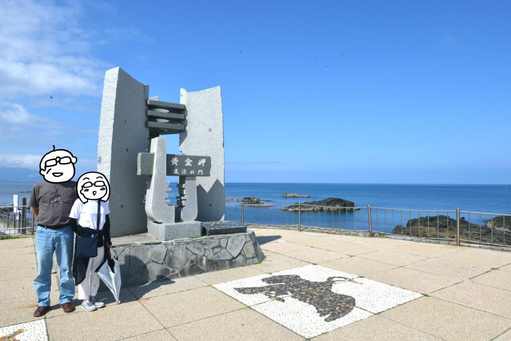 *黄金岬:海の水の綺麗さに驚かされます。青空と青く透き通った水、波の音で心が洗われます。岩場が歩けるようになっていたので、ついつい子どものようにあちこち歩き回ってしまいました。車で少し回り込むようにして裏手の高台に上ると「ふるさと館」という食事ができる建物がありましたが、まだ開店時刻前でした。