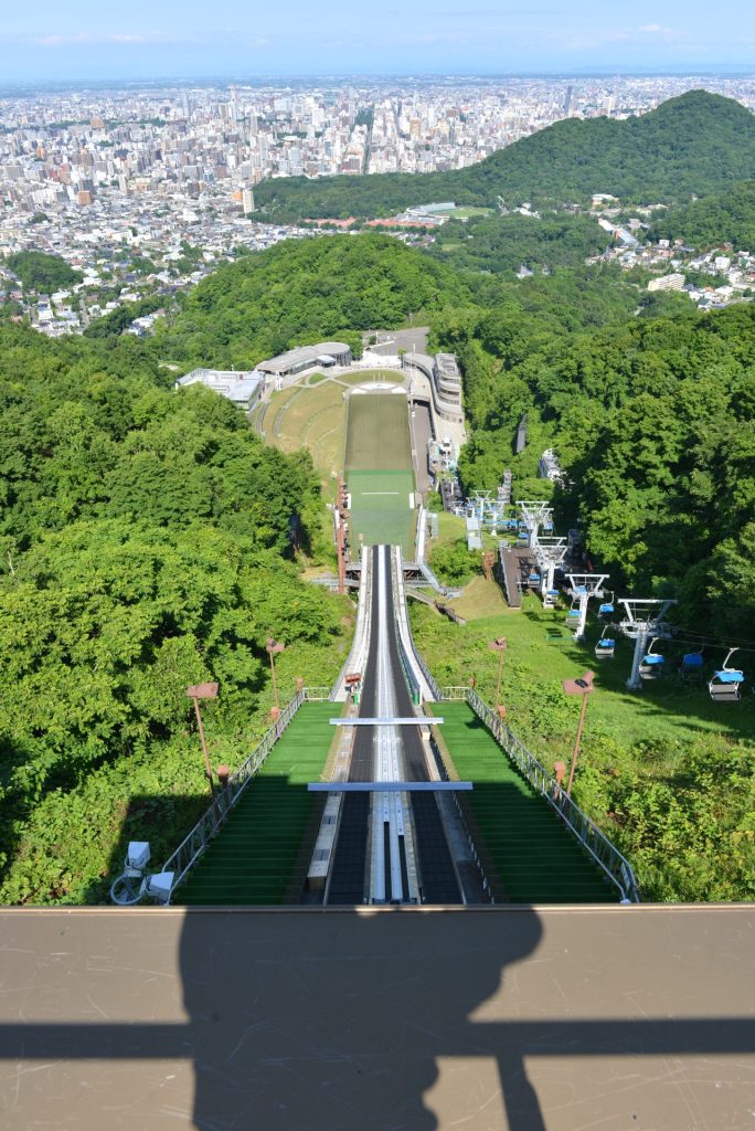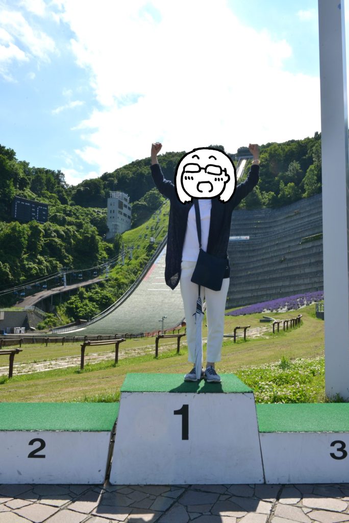 大倉山ジャンプ競技場の駐車場に着いたのが午後2時頃。ジャンプ台へは、エスカレーターで上ります。エスカレーターから少し進むと左右に建物があり、右の建物が土産物を売っていたり、リフトのチケットを売ったりしていました。リフトの往復チケットを購入し、誰もがするであろう、表彰台で写真を撮り、リフトへ。ジャンプ競技の斜面が急なことはテレビを視ていても知っていましたが、真横から眺め、自分がそこを滑っていることを想像すると怖くなるほどです。頂上から下を覗き込むと、今度は、滑るというよりも「落ちる」という言葉の方が合っていると感じます。ジャンプ競技の中継を見る目が変わりました。
