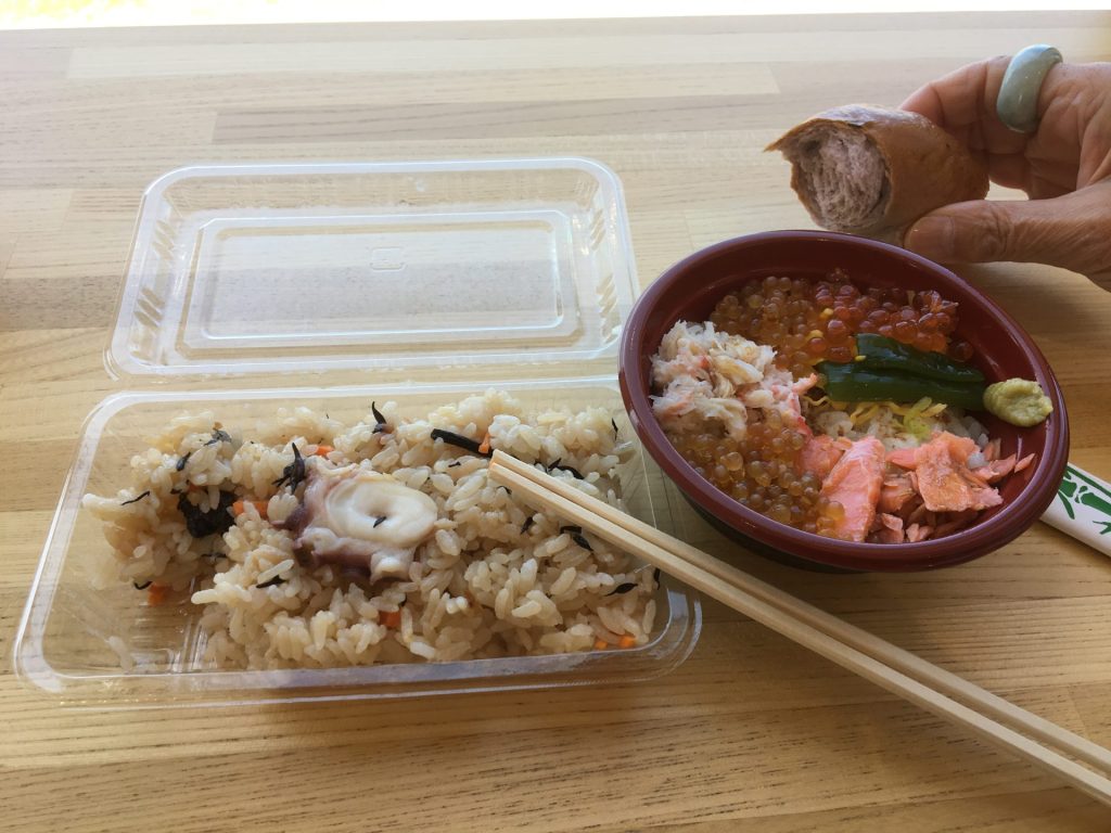 留萌から札幌までは130kmほどのロングドライブ。途中、道の駅「あいろ〜ど厚田」でトイレ休憩。お昼も近かったので施設内のテイクアウトの店で海鮮丼を購入し、展望ラウンジでいただきました。この道の駅は、登録が平成29年と若く、施設も駐車場もとても綺麗でした。海抜が30m弱あり、道路より一段高くなったところにあるので海が一望できます。夕日を見るには申し分なさそうでした。