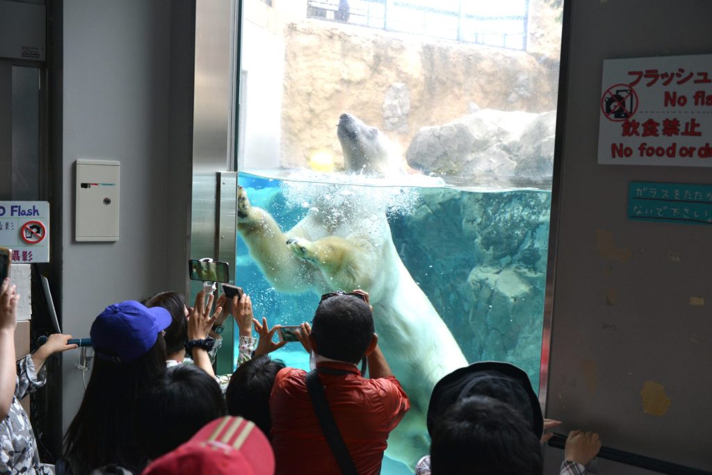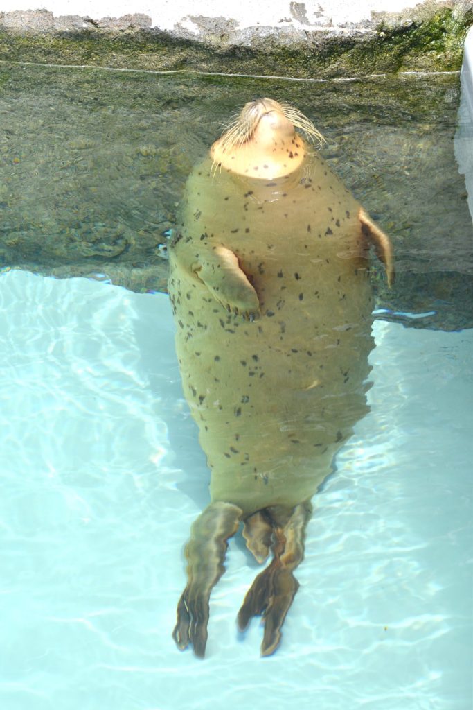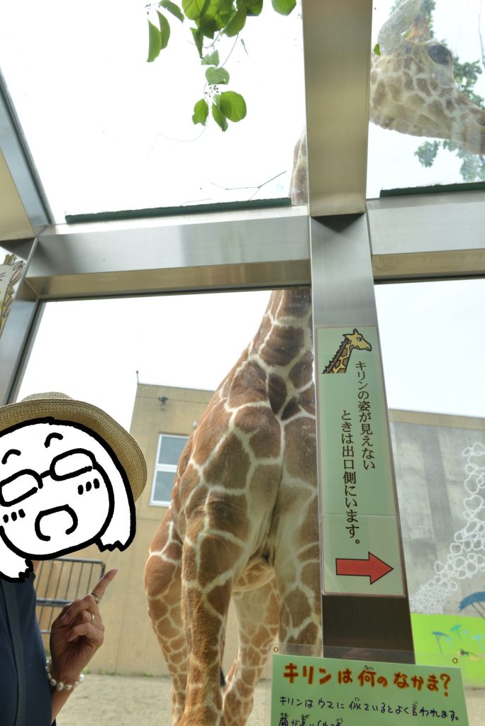 ゲートを潜ったところにあった案内図を見ながらルートを考えました。園内は結構起伏がありそうでしたので、できるだけ楽して回りたいものです。ざっくりと時計回りに回ることにしてゆっくり進んでいくと、最初にキリンがいました。上からだけでなく下の窓からも眺めることができます。檻の中をただ見ているのとは随分違うものです。そのあとは、カバやらペンギンやらホッキョクグマやらをながめ、最後はアザラシに癒やされて大満足。