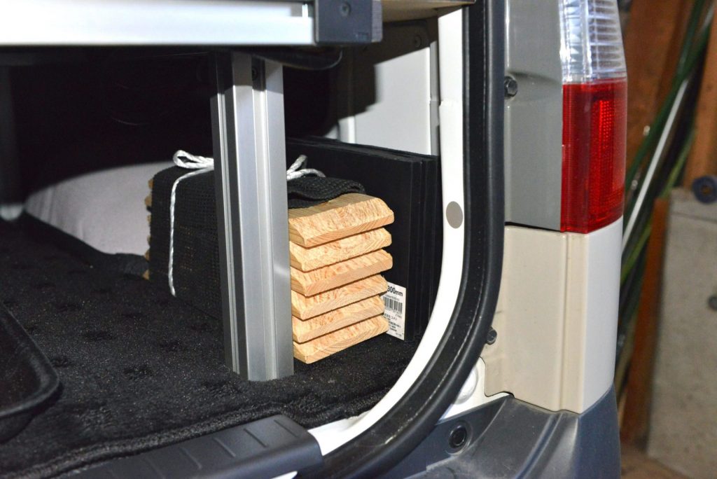 車内の水平のために用意した傾斜補正板でしたが、九州を回っていた時に別の大活躍をしたことがありました。早朝、私たちもそろそろ出発という頃、隣のスペースに駐車しようとした車が勢い余って車止めに前輪の片方を乗り上げてしまったのです。戻す時にバンパーが引っかかる恐れがあり、そうなれば、手伝いに行った私と別の車中泊の方だけではどうにもならなくなってしまいそうでした。そこで登場したのが傾斜補正板。車止めの高さから路面の高さまで、二段のステップになるように置いてみたところ、バンパーを引っかけることなく、無事救出することができました。予想していなかった活用事例となりました。