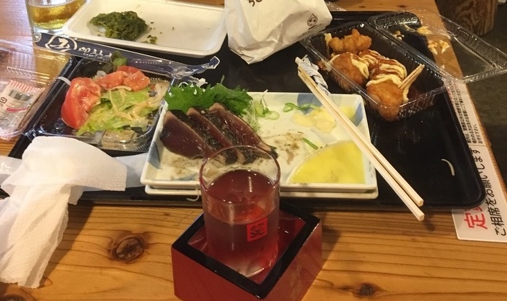 チェックインできる時間になりましたので、再び「とさでん」に乗ってホテルへ戻り、部屋に荷物を入れました。部屋で少し休憩し、5時を回った頃にホテルを出て向かったのが「ひろめ市場」。テレビでもよく取り上げられていたので、高知市に来たらどうしても寄ってみたいと思っていました。入ると、「市場」という名前の通り、通路の両側に店がずらっと並び、テーブルと椅子がたくさん置かれていました。まだ5時を過ぎたばかりだというのに、空いている席が見つからないほどでしたので、とりあえず、一回りすることに。ほぼ一周という辺りでようやく空席を発見し陣取ることに。すると、すかさず目の前の店の外国人の店員が寄ってきて、何か注文してくれと結構強めに言ってきて面食らいましたが、譲歩して注文。ですが、ですが、ビールが目当ての「ひろめ市場」ではありません。私は、本場のかつおの塩たたきを食べてみたかったのです。辺りを見渡すと、ガラスの向こうで勢いよく炎が上がる店がありました。看板を見ると、塩たたきの店です。列に並んで念願の塩たたきを購入。テーブルに戻って食べた時には、その美味しさにびっくりでした。まずは、鰹の身がほんのり温かいのです。そして、一切れ一切れが厚くて食べ応え十分。それほど時間が経たないうちに食べ終わってしまったので、ウキウキしながらまた同じ店へ。その後は、地元のちょっと高めの日本酒を飲んではお代わりに行ったりしてたっぷりと楽しませていただきました。有名なだけはあるなあ、と唸らされる、そんな素晴らしい「ひろめ市場」でした。次のお遍路の旅でも、間違いなく立ち寄ることでしょう。