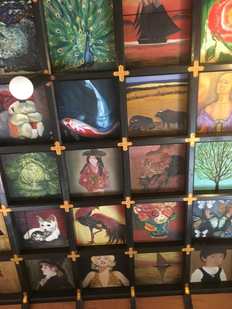 上に書いたように、早朝からの犬騒動で始まった一日。朝一で37番岩本寺へ。ここは、たくさんの天井画で有名なお寺。お参りしてみると、たしかに、本堂の天井一杯に色とりどりの絵がはめ込まれていました。情報誌でもよく紹介されていたマリリン・モンローの絵もありました。500枚以上もあるので、とても一枚一枚丁寧に眺めることはできませんでしたが、何枚かに目をとめて楽しみました。